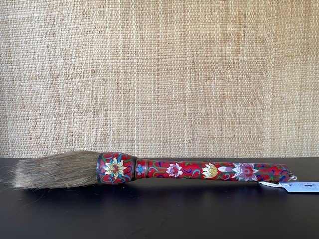 Decorative cloisonné brush measuring 38 cm, aged about 50 years, a true testament to Chinese refinement. The copper or brass handle is entirely covered with multicolored enamel. Each metal partition, hand-soldered, delineates cells of shiny enamel that have endured the centuries without losing their luster. The tuft of natural bristles.